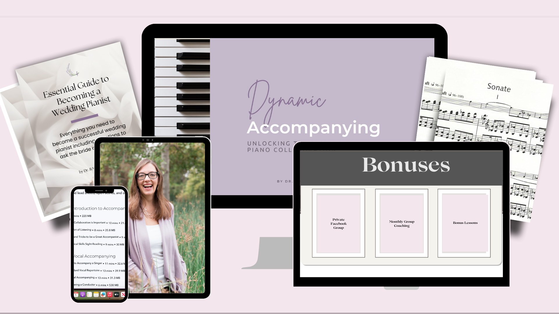 The course is fully digital (online) and you will get access to one module per week for 5 weeks. There will be video lessons for you to watch, piano accompanying exercises for you to practice, and monthly group coaching calls where you can ask questions and check in on your progress.